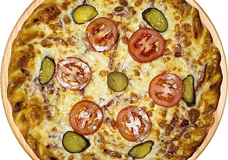 Pin-Up огурец марин., помидор, красный соус, сыр Моцарелла, сыр Гауда, лук красный, фарш, соус