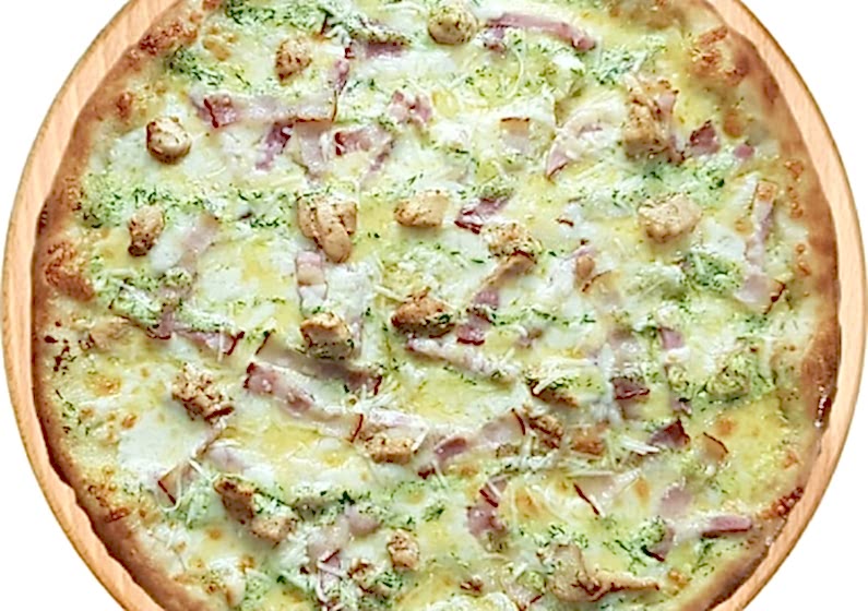 Ветчина, Pin-Up бекон, сыр Гауда, сыр Моцарелла, сыр Пармезан, сметанно-чесночный соус, кунжут