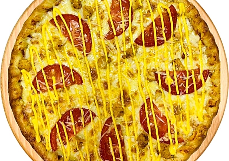 Курица, курица копч., лук красный, помидор, Pin-Up соус, сыр Моцарелла, сыр Гауда, Пармезан, огурец марин., соус