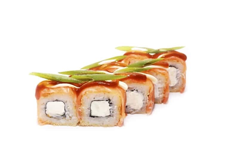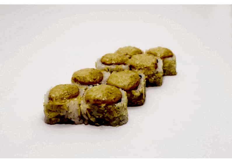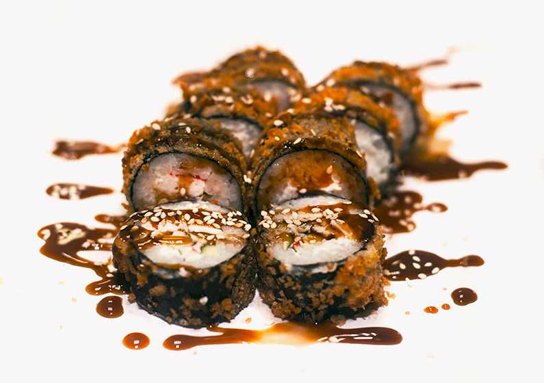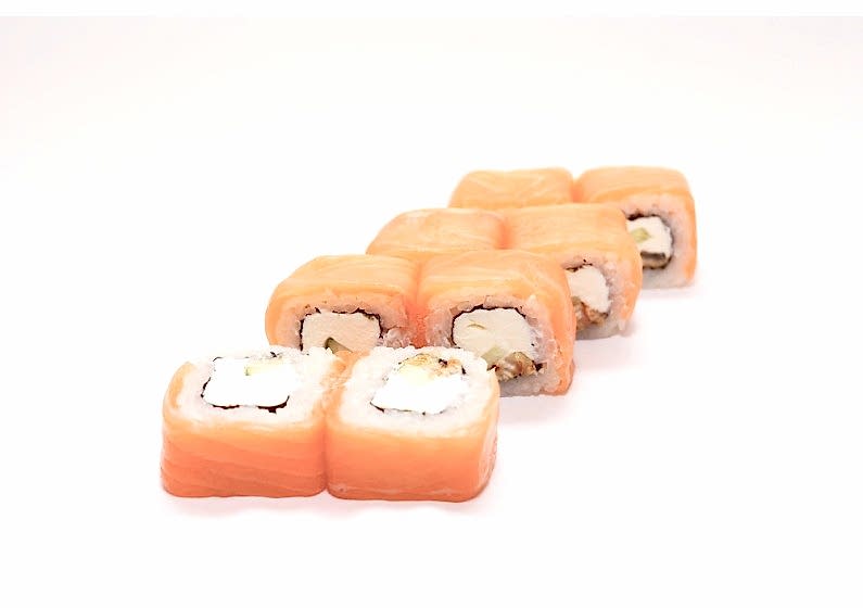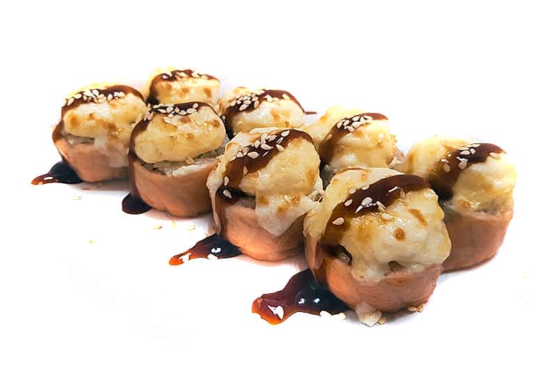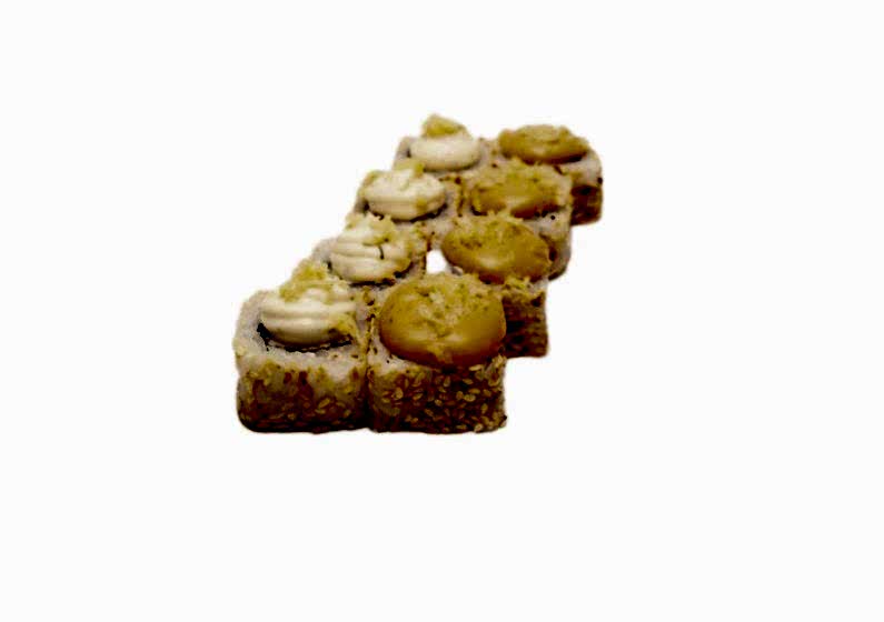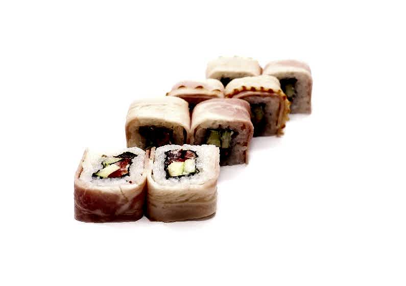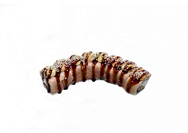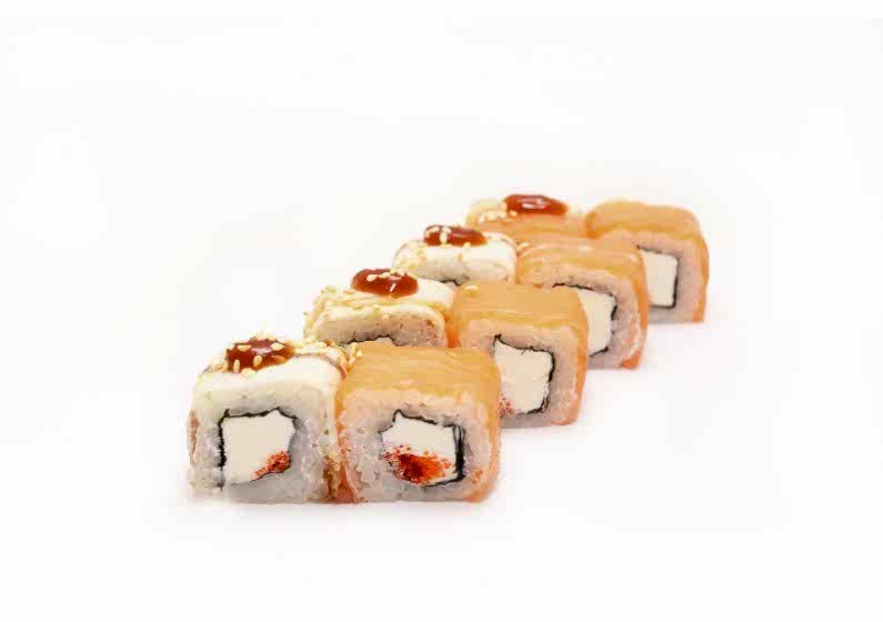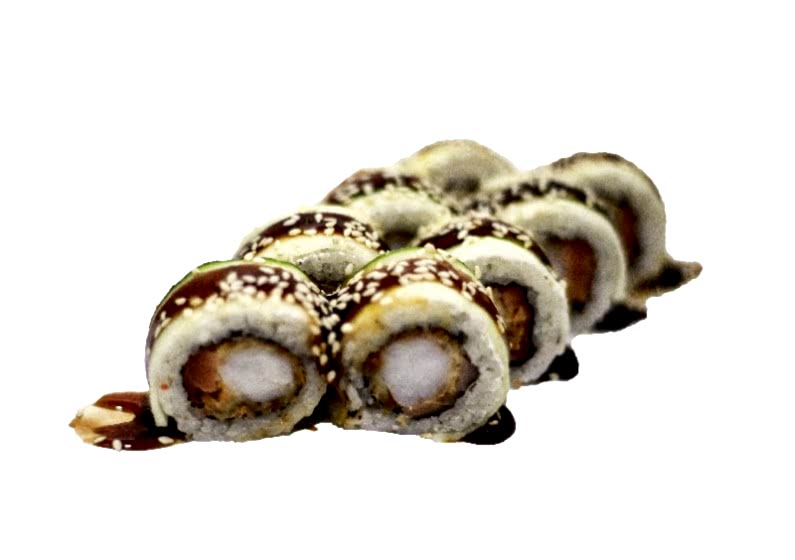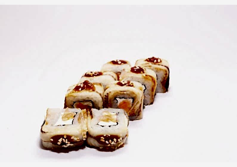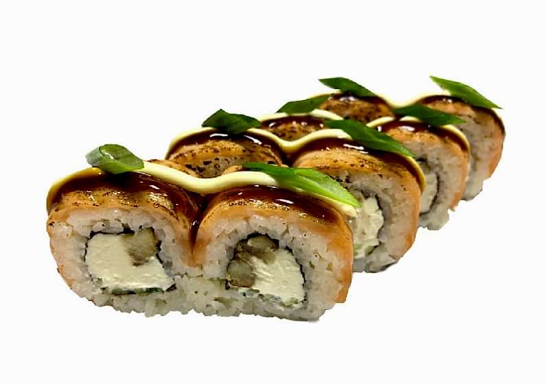 Угорь, лосось опаленый, огурец, Pin-Up майонез, лук зеленый, рис, нори, унаги соус ИМБИРЬ, ВАСАБИ и СОЕВЫЙ соус- прибретаются отдельно!!
