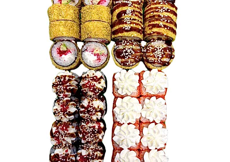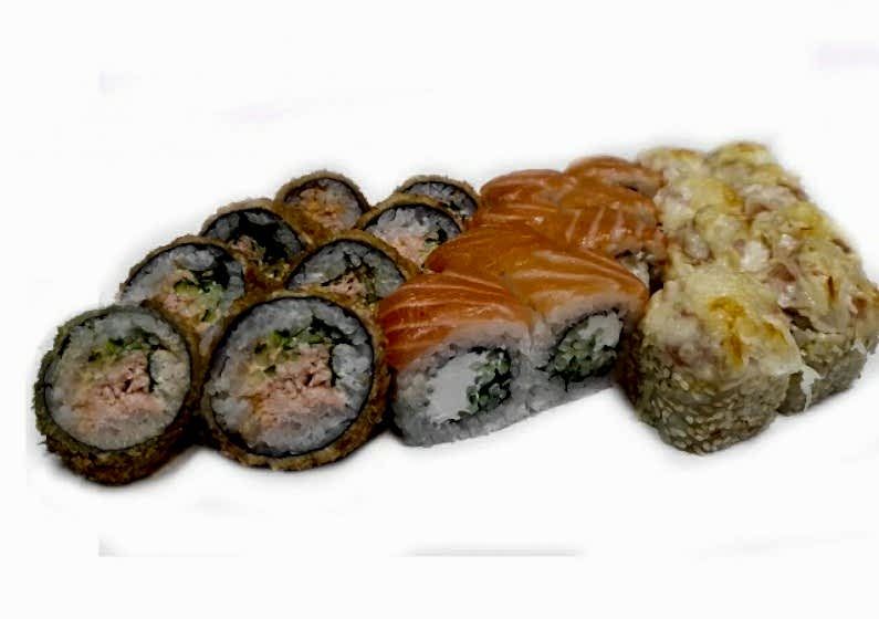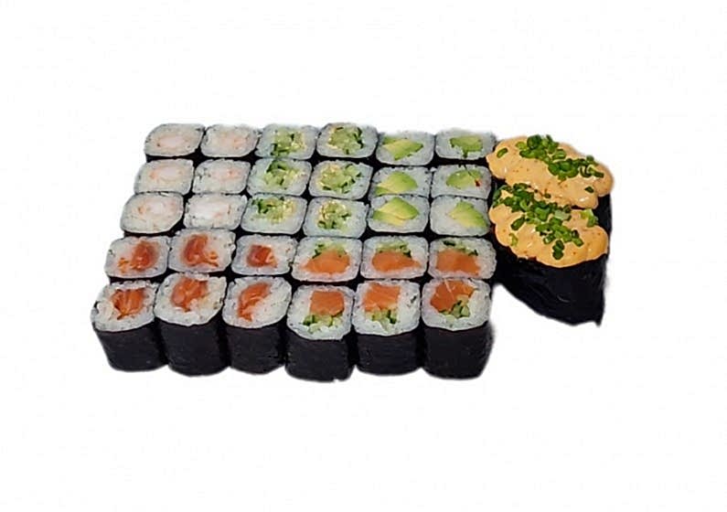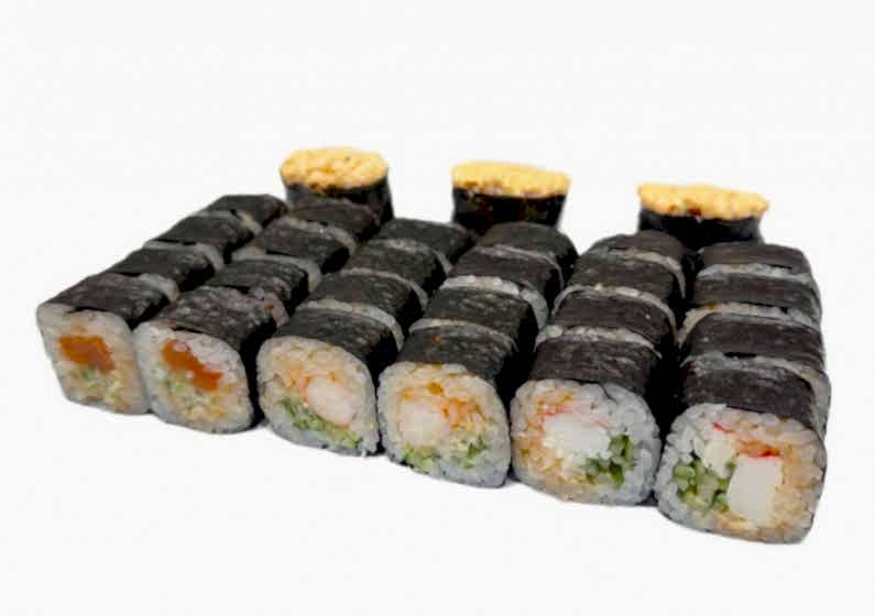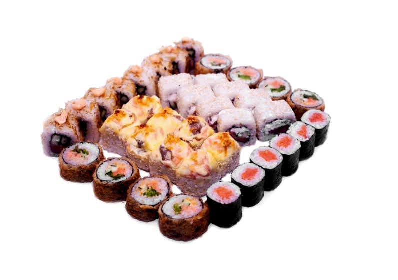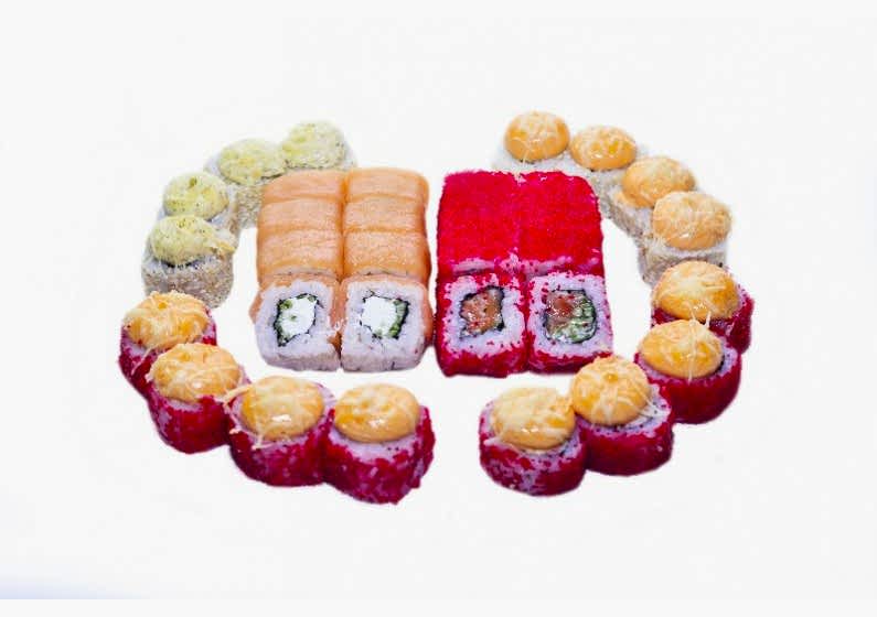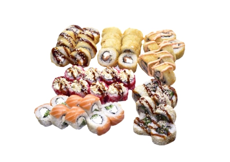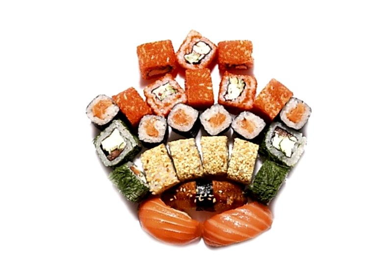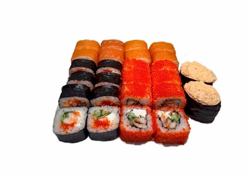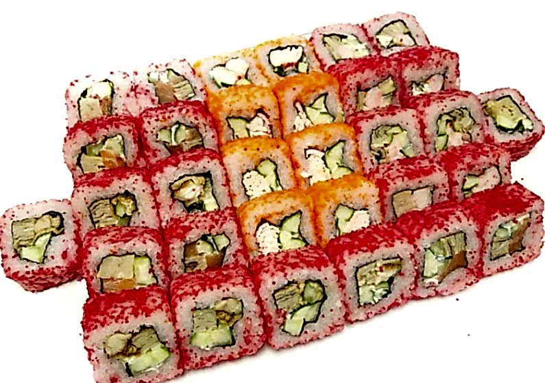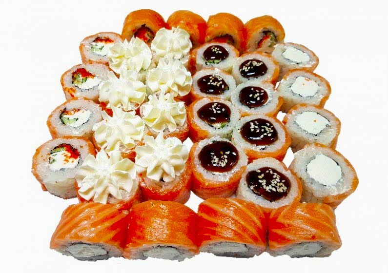 32 шт. Pin-Up лосось, ролл креветка, ролл огурец, ролл с авокадо, ролл копченный лосось, гункан спайси копченный лосось- 2. Упаковано на 2 персоны!!