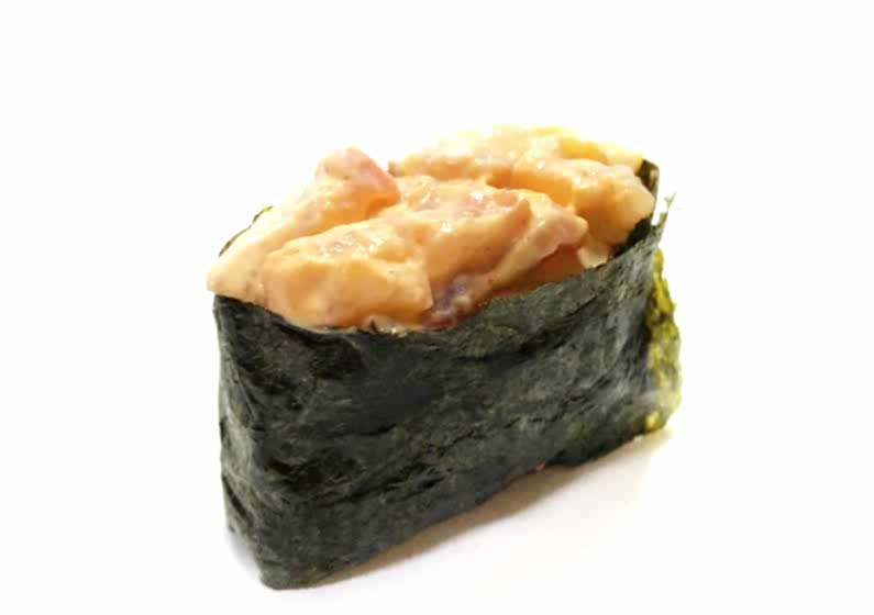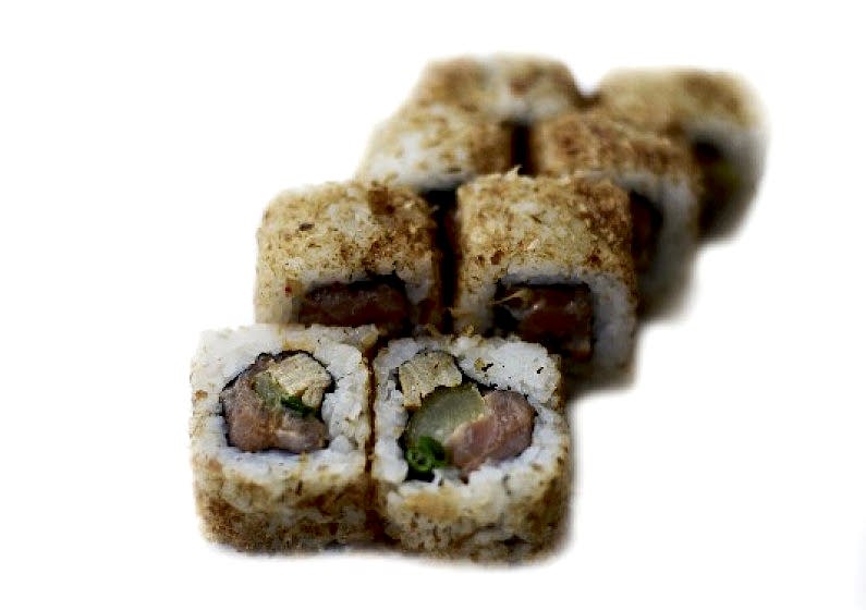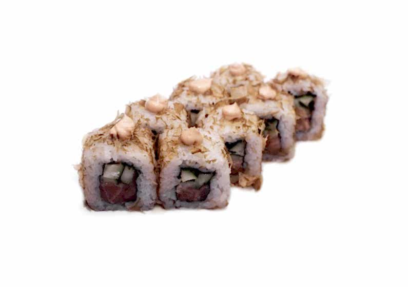 Копченый лосось, лук зеленый, стружка тунца, маринованный Pin-Up спайси соус, рис, нори ИМБИРЬ, ВАСАБИ и СОЕВЫЙ соус- прибретаются отдельно!!