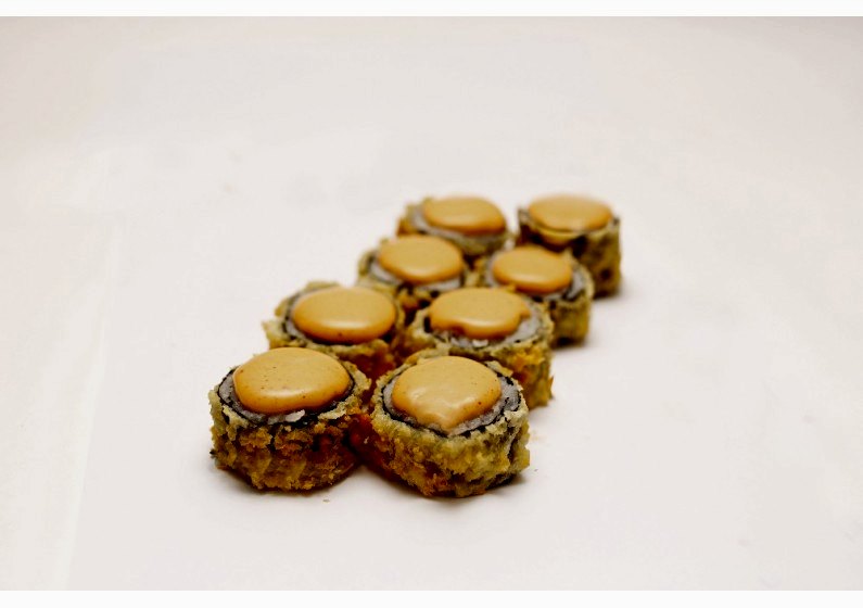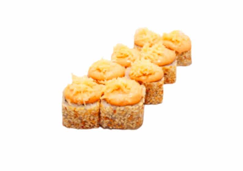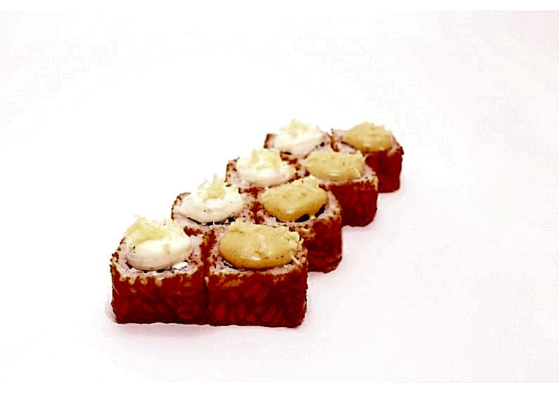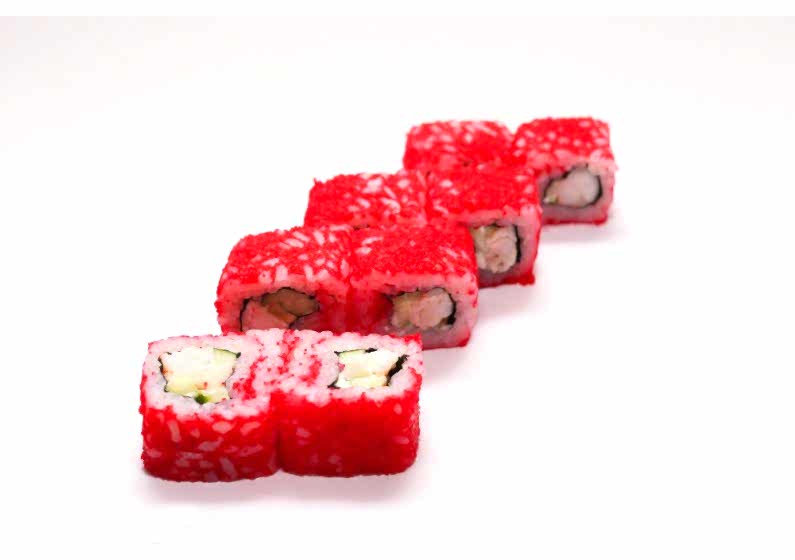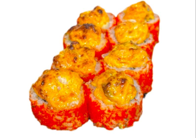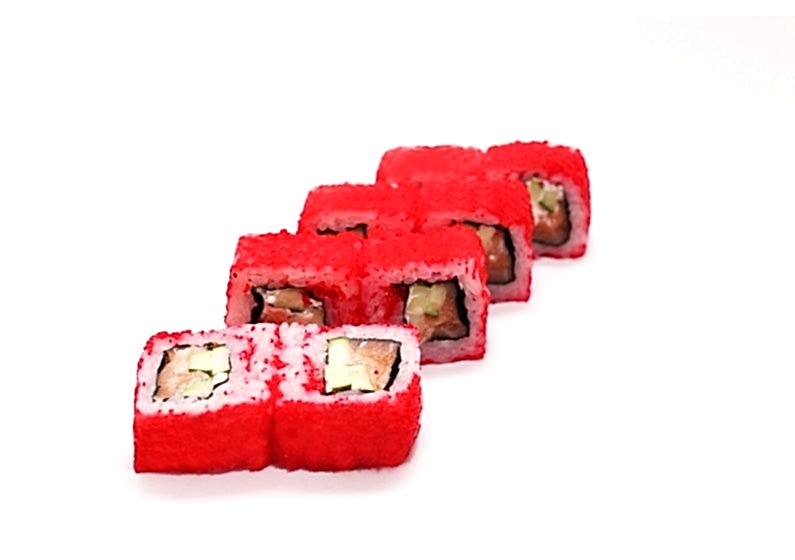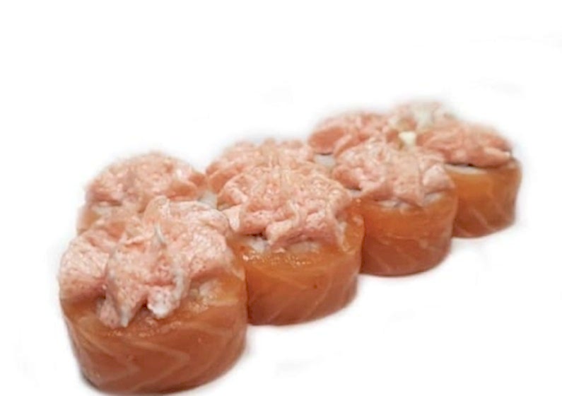 Pin-Up копченый, Спайси соус, икра Масаго, огурец, рис, нори ИМБИРЬ, ВАСАБИ и СОЕВЫЙ соус- прибретаются отдельно!!