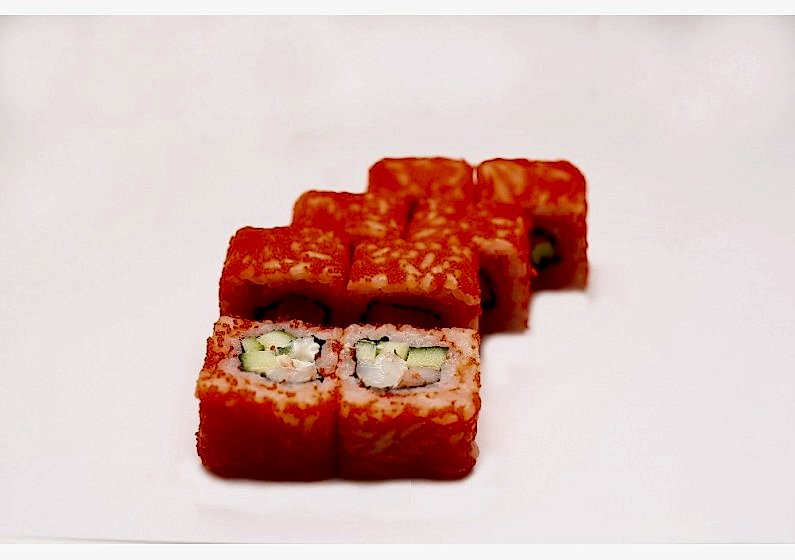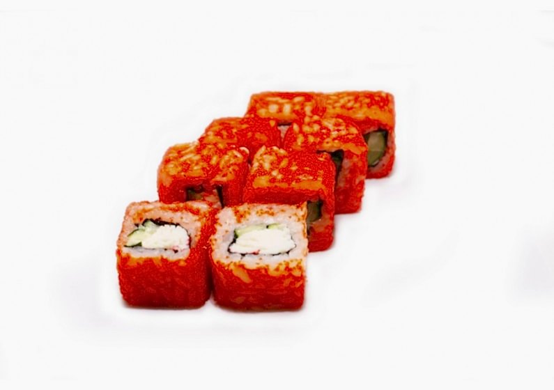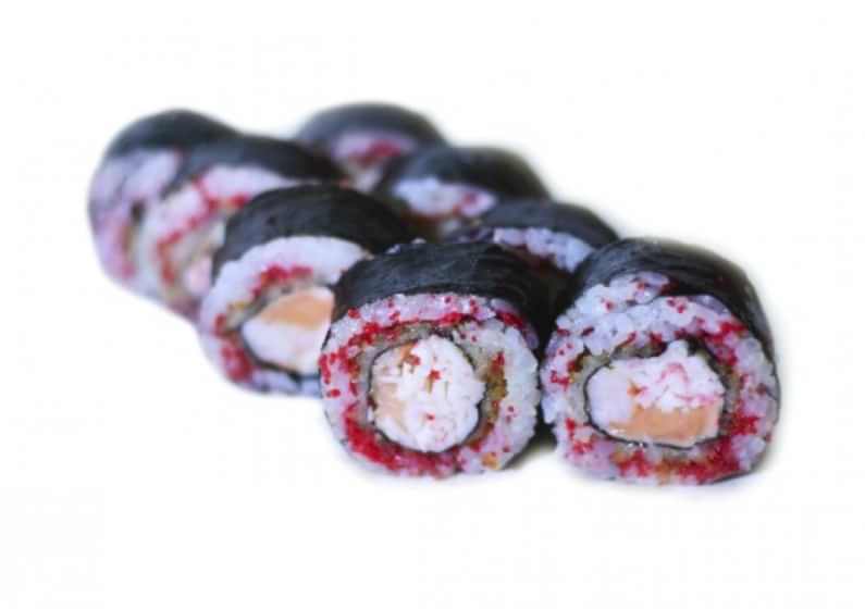 Лосось, икра Масаго, сливочный сыр, огурец, рис, нори ИМБИРЬ, ВАСАБИ и СОЕВЫЙ соус- прибретаются отдельно!!