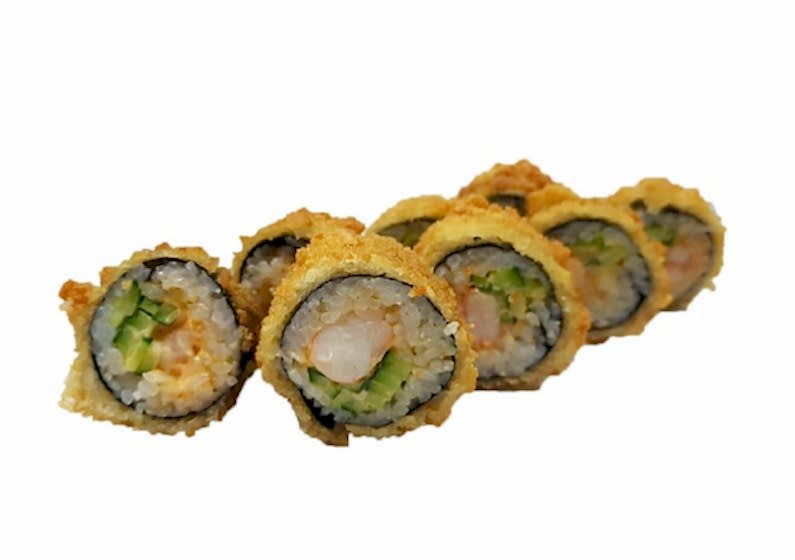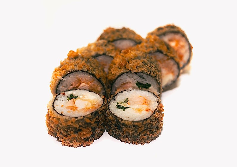 Креветка темпура, лосось копч, огурец, Унаги соус, кунжут, рис, нори ИМБИРЬ, ВАСАБИ и СОЕВЫЙ Pin-Up прибретаются отдельно!!
