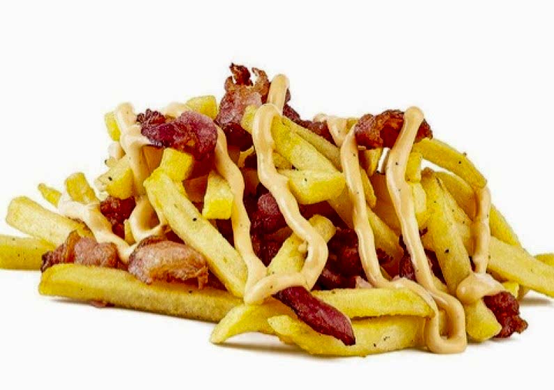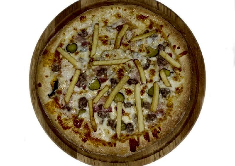 Сыр, Pin-Up соус красный, бекон, фарш, грибы, огурец марин., лук зеленый, картофель фри